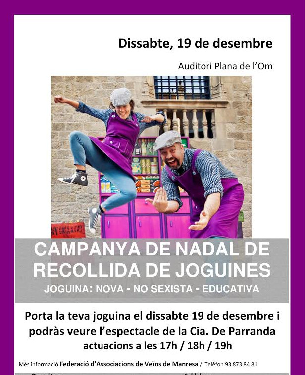 Comunicat FAVManresa.- La FAVManresa, amb la gent del Pla Comunitari us convidem a gaudir d’un dia molt especial: a canvi d’una joguina nova obtindreu una invitació per a dues persones per gaudir de l’espectacle, podeu aconseguir la butlleta a les associacions veïnals, també a l’auditori de la Plana de l’Om, el dissabte vinent 19 de desembre on hem organitzat: