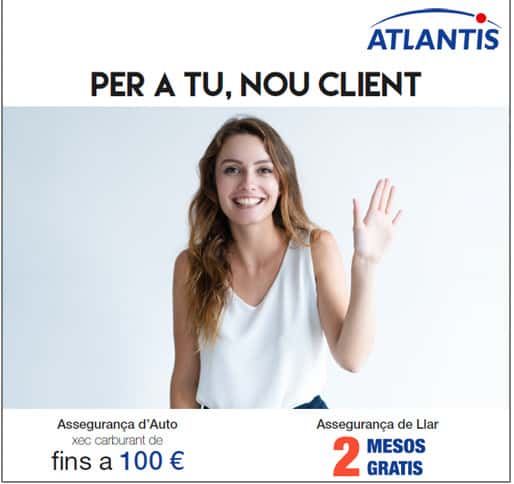 Informem els veïns i veïnes que fins al proper 31 de juliol, ATLANTIS, el servei assegurador del veïnat, ofereix interessants campanyes per a nous clients, quan contractin una pòlissa de Llar o de Cotxe.