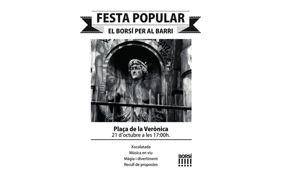 Comunicat AV Barri Gòtic.- Veïns i veïnes del Barri Gòtic, agrupats/des dins la plataforma veïnal El Borsí Per Al Barri, organitzen el proper divendres 21 d’octubre a la plaça de la Verònica una festa popular per presentar la plataforma, reivindicant que l’edifici del Borsí (c/Avinyó, 23) sigui rehabilitat i convertit en un espai veïnal amb la creació, difusió, promoció i experimentació de les arts com a eix vertebrador i que inclogui també el casal de joves autogestionat del Barri Gòtic.
