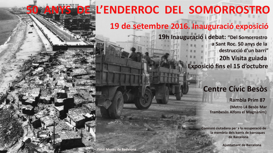 Comunicat Comissió per la Memòria dels Barris de Barraques .- Dilluns 19 de setembre, a les 19h, es celebrarà la inauguració de l’exposició “50 anys de l’enderroc del barri del Somorrostro”, amb un col·loqui amb historiadors i antics veïns del barri, seguit d’una visita guiada de l’exposició, amb motiu dels cinquanta anys d’un fet històric, l’enderroc del barri de barraques del Somorrostro i el trasllat forçós dels seus habitants.