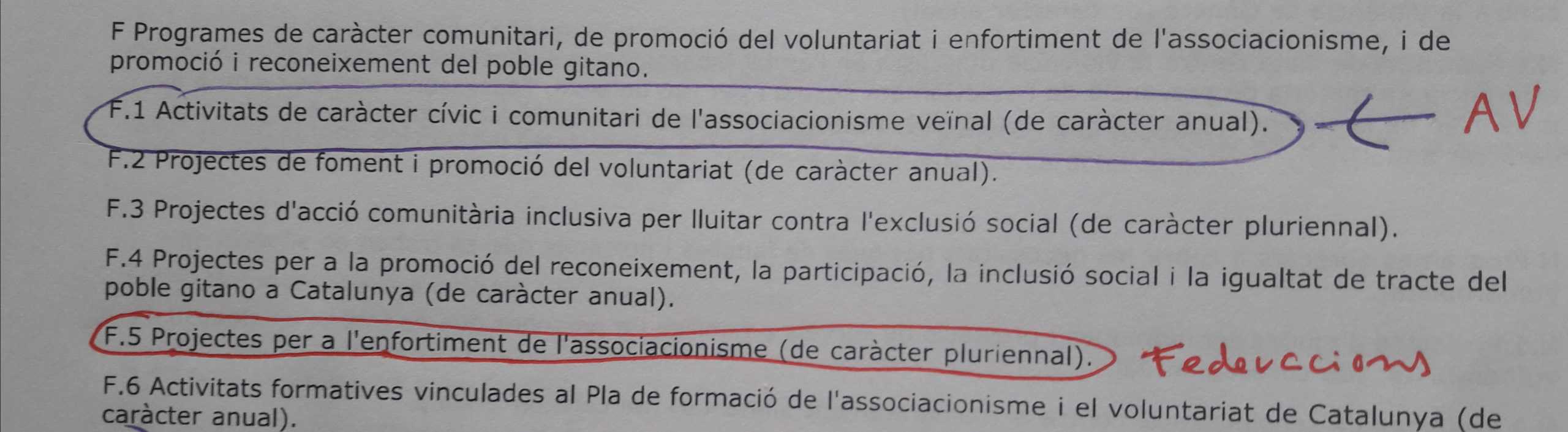 Cal destacar que enguany hi ha una línia de subvencions – F1. Activitats de caràcter cívic i comunitari de l’associacionisme veïnal – que és específica per a subvencionar les activitats que anualment les entitats veïnals fan, però l’especificitat d’aquesta convocatòria és que si aquesta subvenció es gestiona a través d’una federació veïnal, automàticament passa a puntuar-se més tot el projecte.